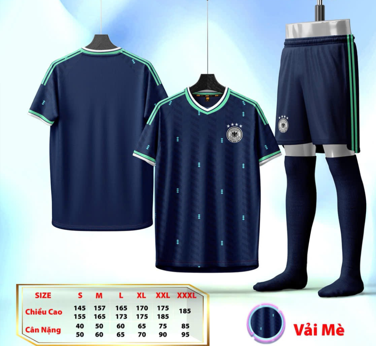 Mẫu áo bóng đá đội tuyển Đức phối xanh–đen 2026–2027 mang cảm hứng mạnh mẽ của “Cỗ xe tăng Đức”, kết hợp nét cổ điển với phong cách hiện đại. Tông xanh đen tạo cảm giác nam tính, gọn gàng, nhìn nổi bật trên sân nhưng vẫn giữ sự lịch lãm đặc trưng của tuyển Đức.