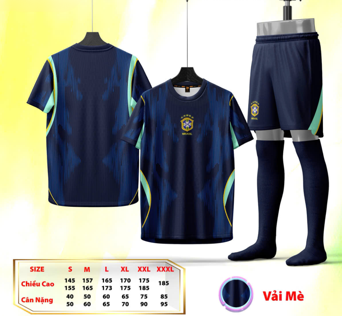 Mẫu áo bóng đá đội tuyển Brazil phối xanh–đen 2026–2027 mang tinh thần mạnh mẽ, đậm chất “chiến binh” trên sân cỏ. Thiết kế xanh đen cá tính với họa tiết tạo điểm nhấn nổi bật, phần logo viền thêu/bo gọn giúp tổng thể trông cứng cáp và dễ nhận diện.